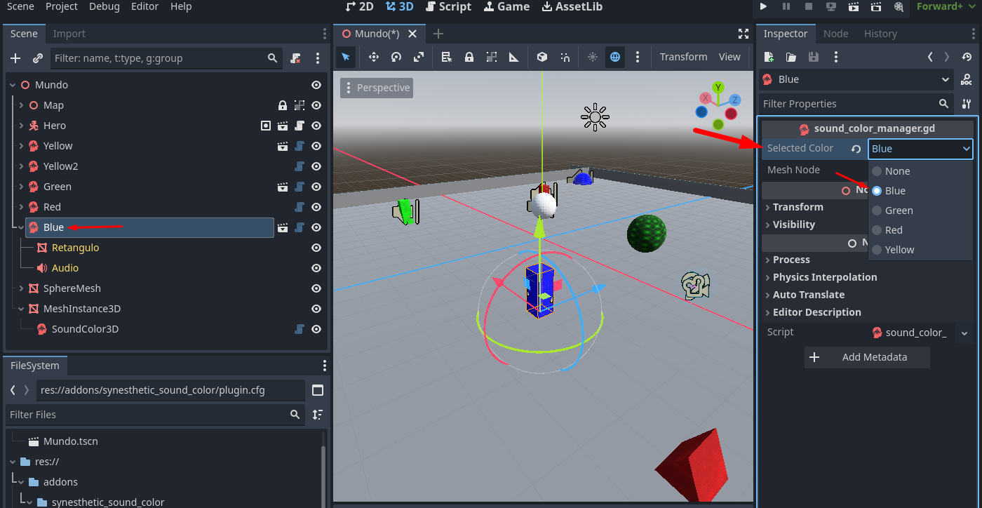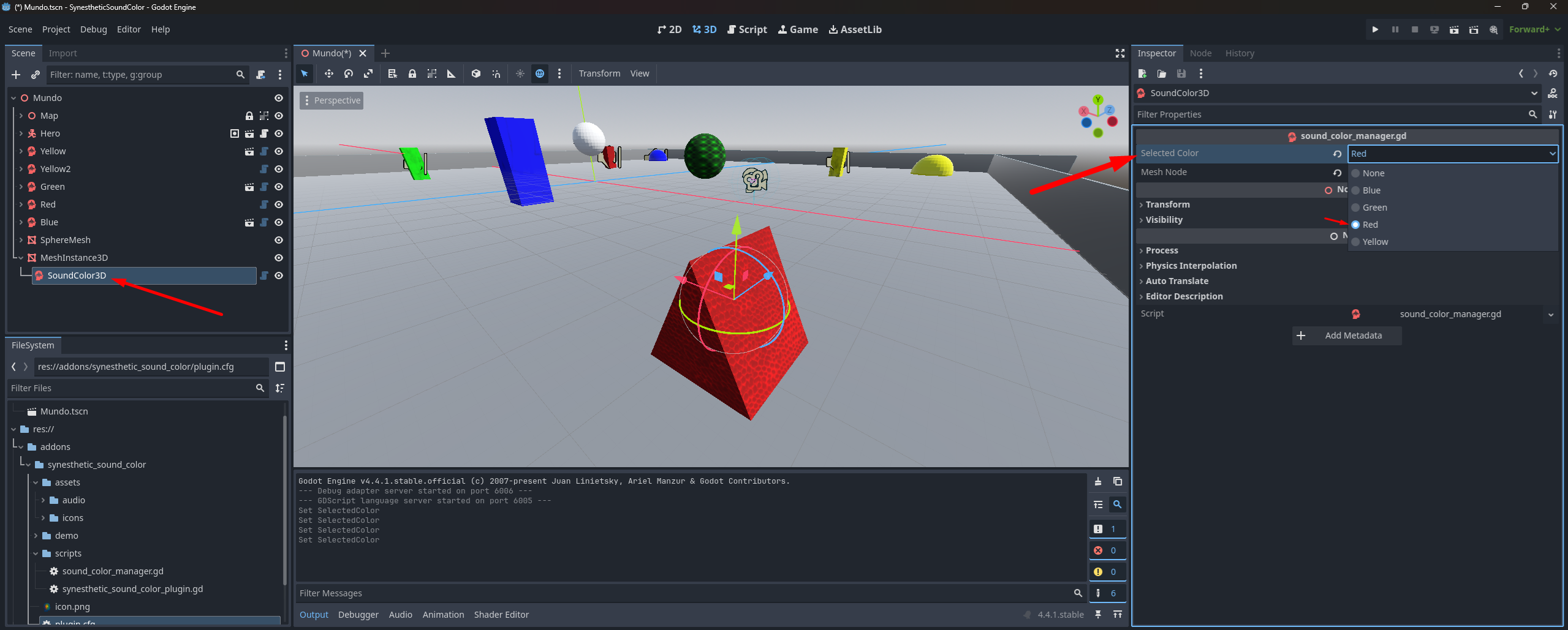 This plugin lets you override a MeshInstance3D’s albedo color and play a corresponding sound when a color is selected. It creates or reuses a StandardMaterial3D override and an AudioStreamPlayer3D, supports editor preview and runtime, and allows selecting the target mesh via NodePath or auto-detection.