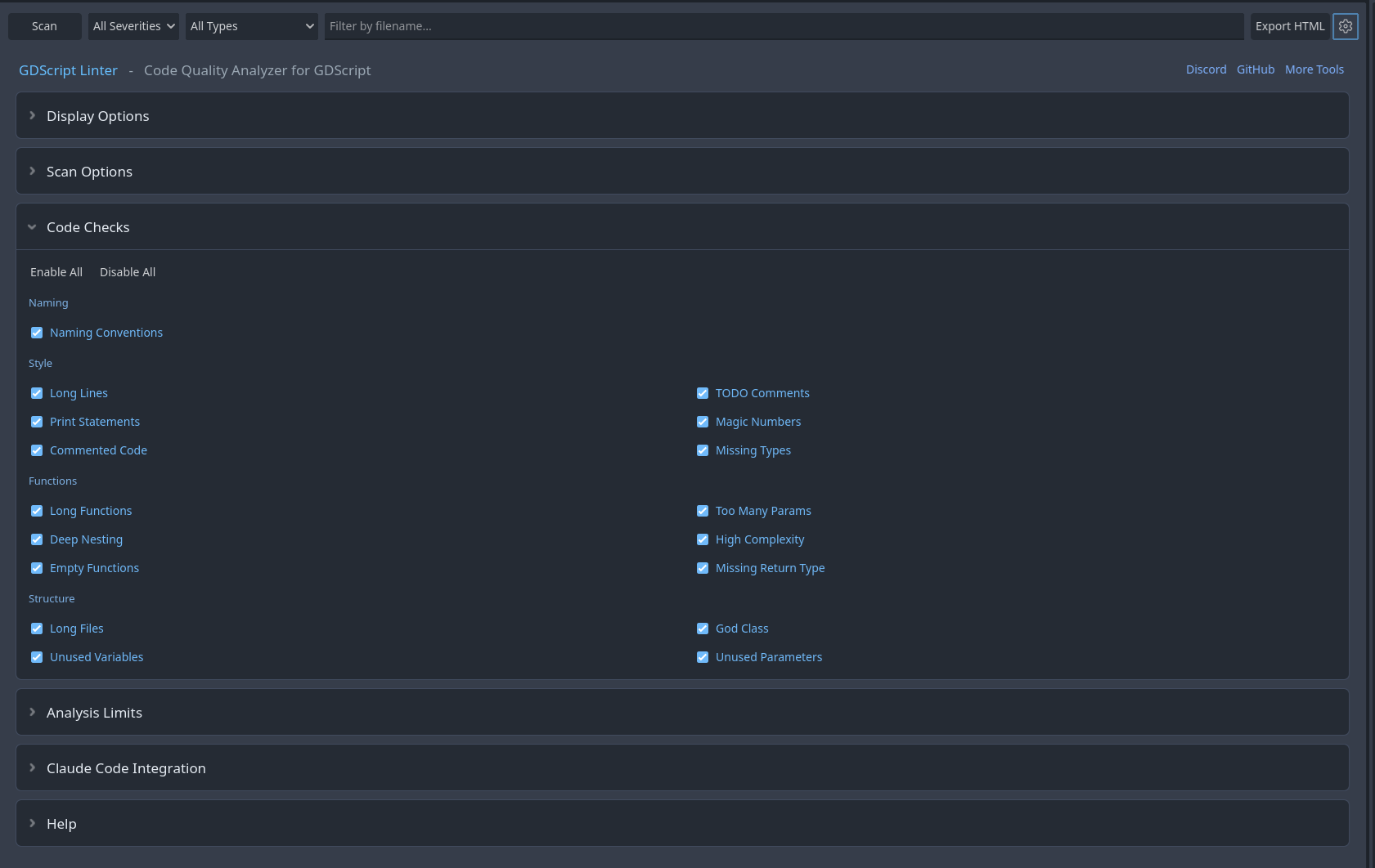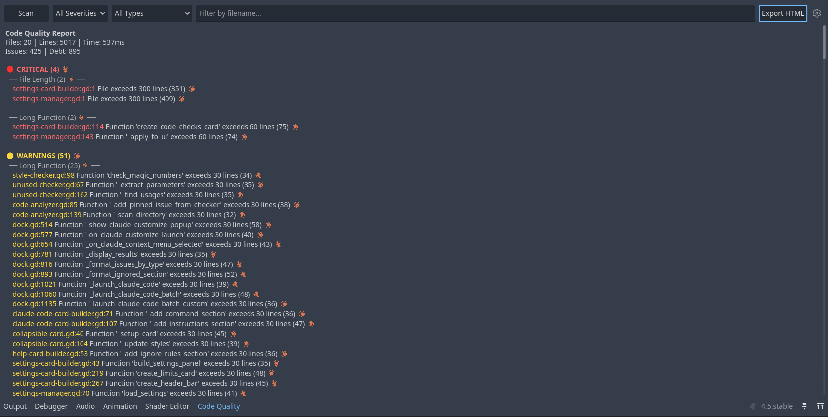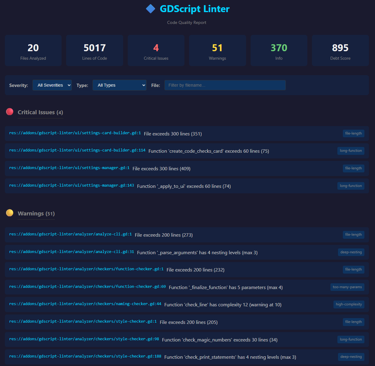 Details: Detects long functions, high complexity, magic numbers, missing type hints, TODO comments, and 10+ other code quality issues. Includes an editor dock with clickable file:line navigation, severity filtering, and a CLI for CI/CD integration. Configurable via settings panel or .gdlint.cfg file.