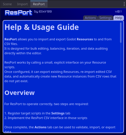 A plugin for importing and exporting Resources via CSV. ResPort enables easy bulk editing for beginners and explicit, predictable data workflows for advanced users, with support for creating new Resources directly from CSV imports.