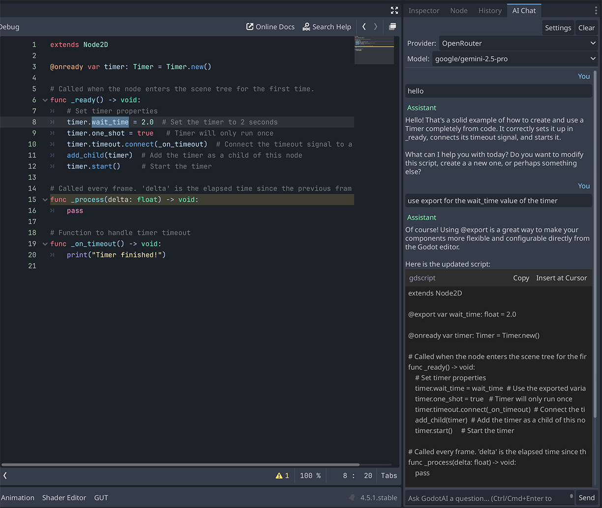 An AI coding assistant built directly into the Godot editor. Chat with Claude, ChatGPT, or any OpenRouter model without leaving Godot get code suggestions, ask questions about your project, and insert AI-generated code straight into your scripts.