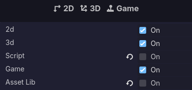 Lets you hide the main screen buttons you do not want to see (2D, 3D, Script, Game, AssetLib) without disabling features.