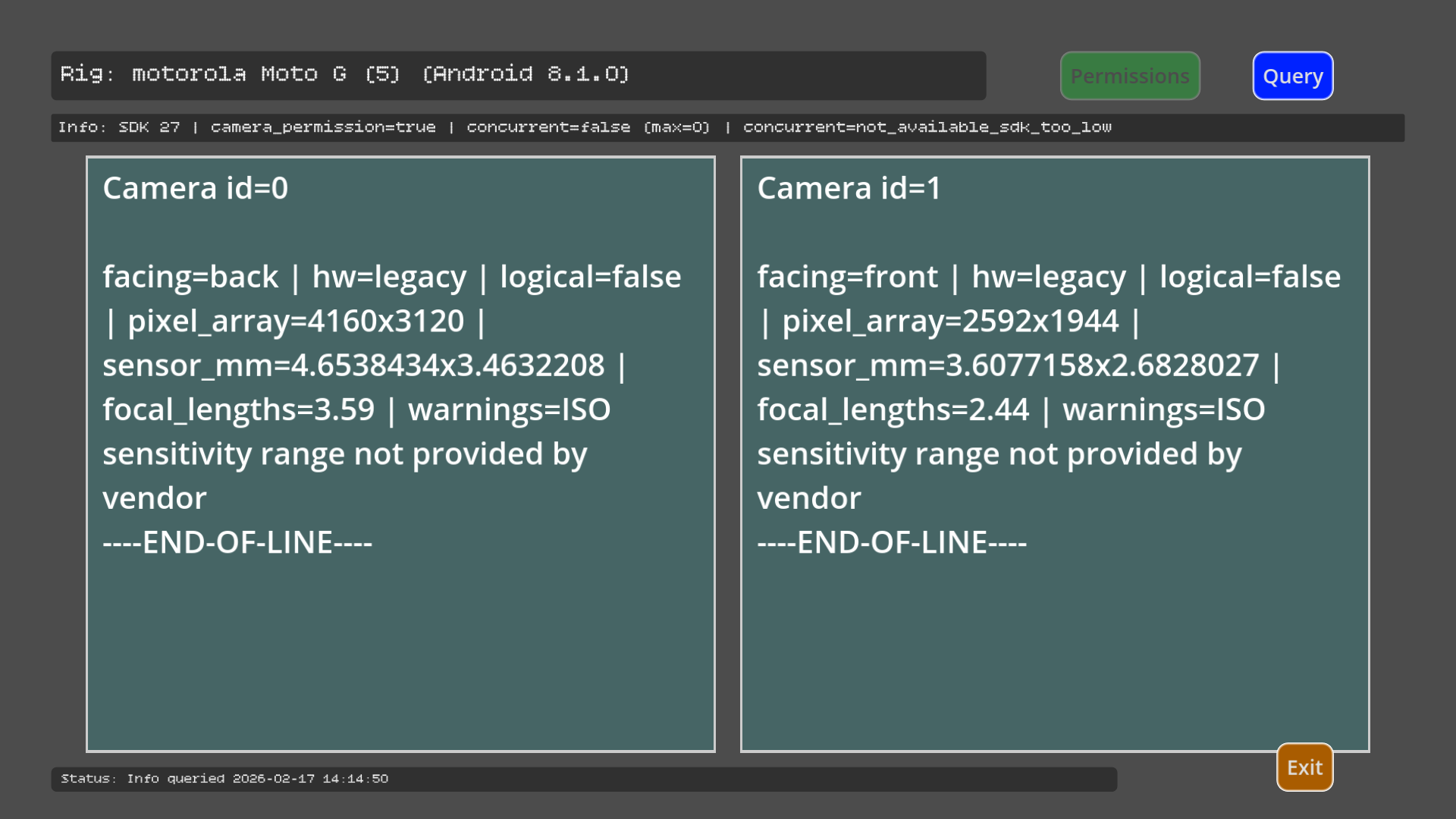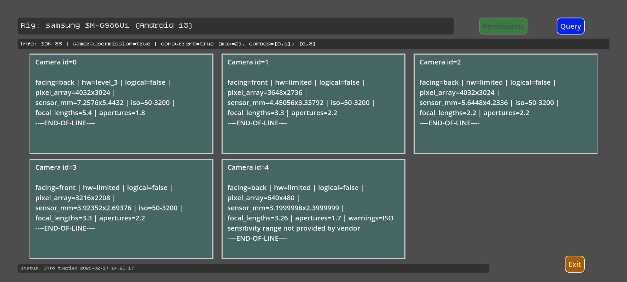 Supplies camera capability info - supported concurrent use, sensor resolution, ISO, focal length, etc - for Android (Camera2) device cameras, into GDscript. Provides a handy json string and user:// file upon request; plus optional export to Documents.