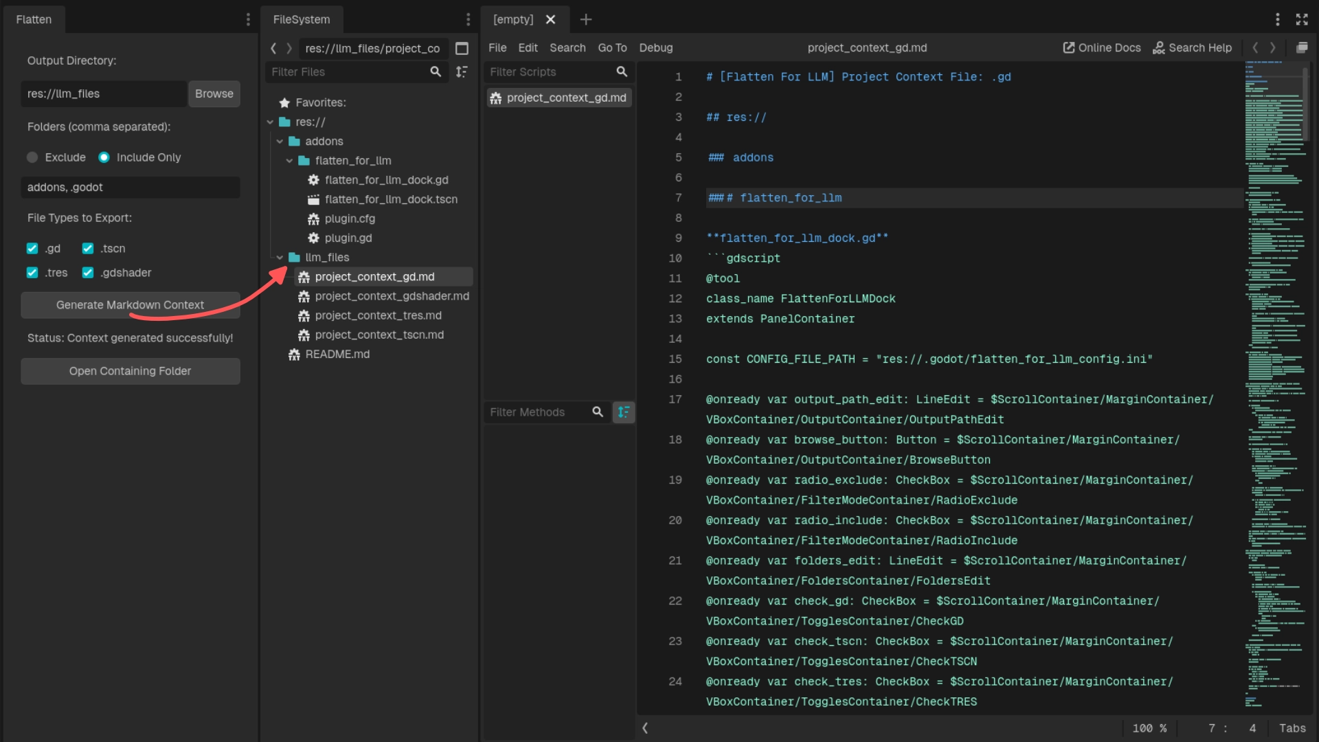 **Flatten for LLM** is a seamless, Godot plugin designed to bridge the gap between your game project and Large Language Models (LLMs).
