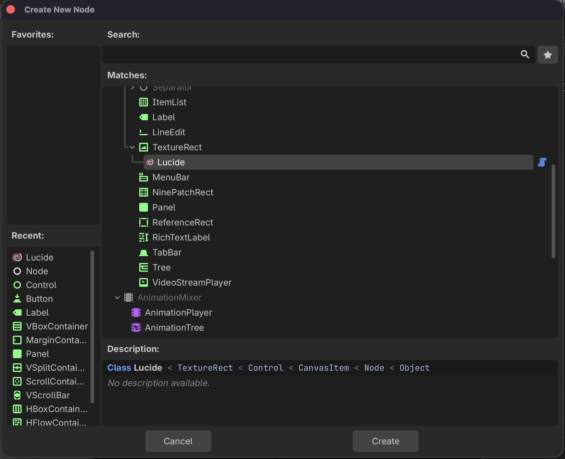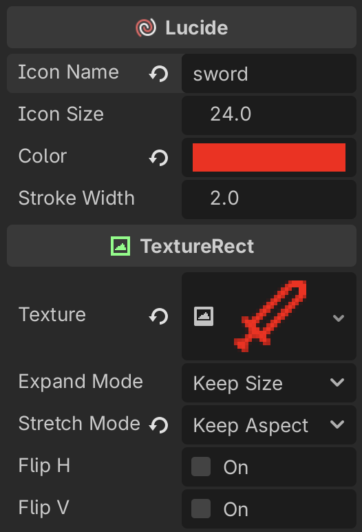 - A custom Lucide node (extends TextureRect) is registered in the editor. Drop it anywhere in your scene tree.