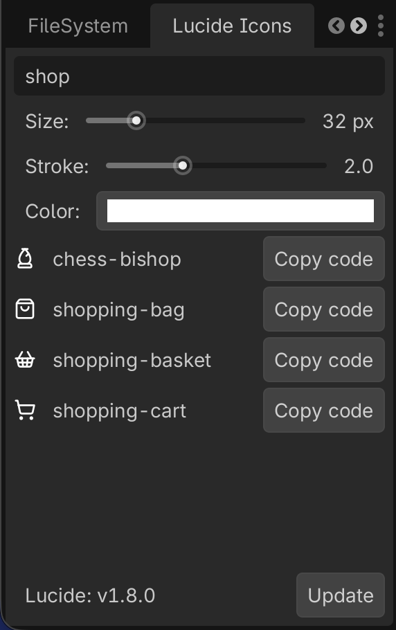 - One-click Update button to pull the latest Lucide release without leaving the editor