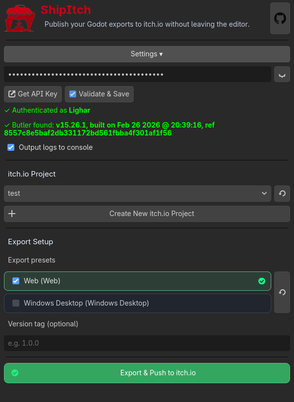 - Build your Godot project and push it straight to itch.io in a single automated step.