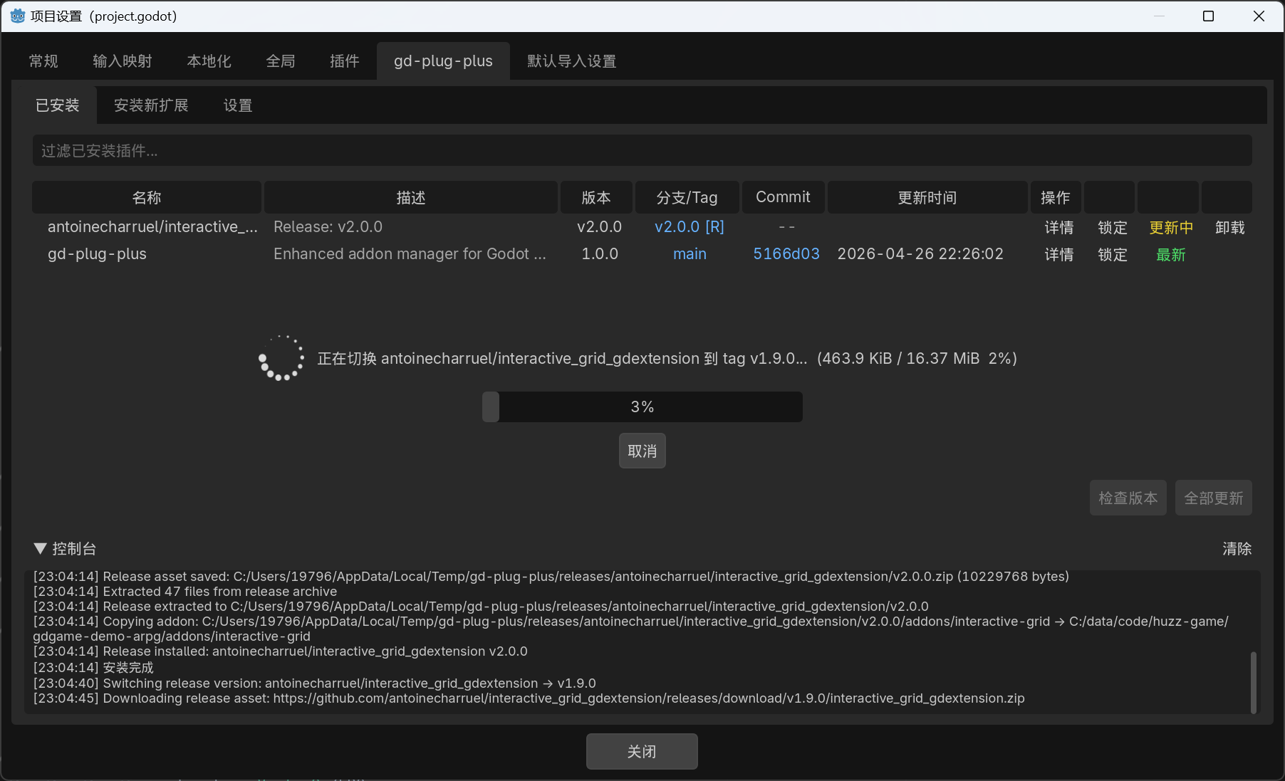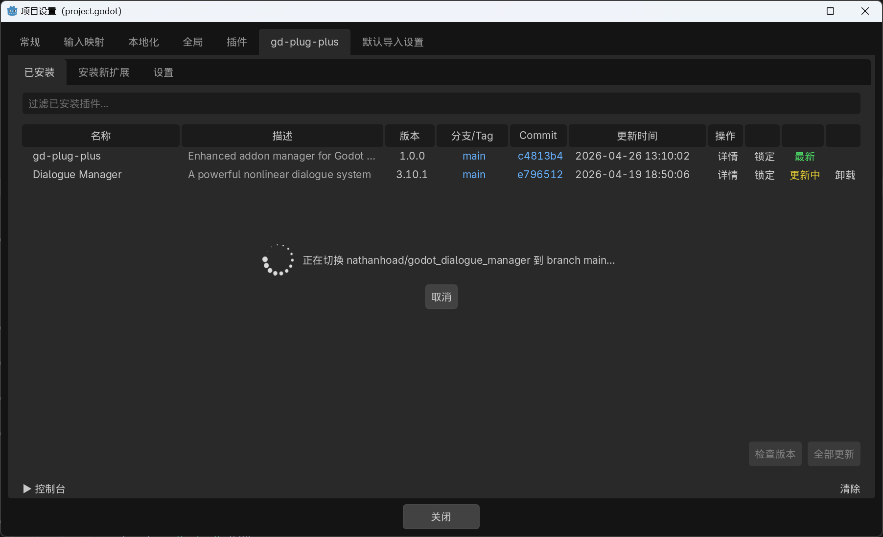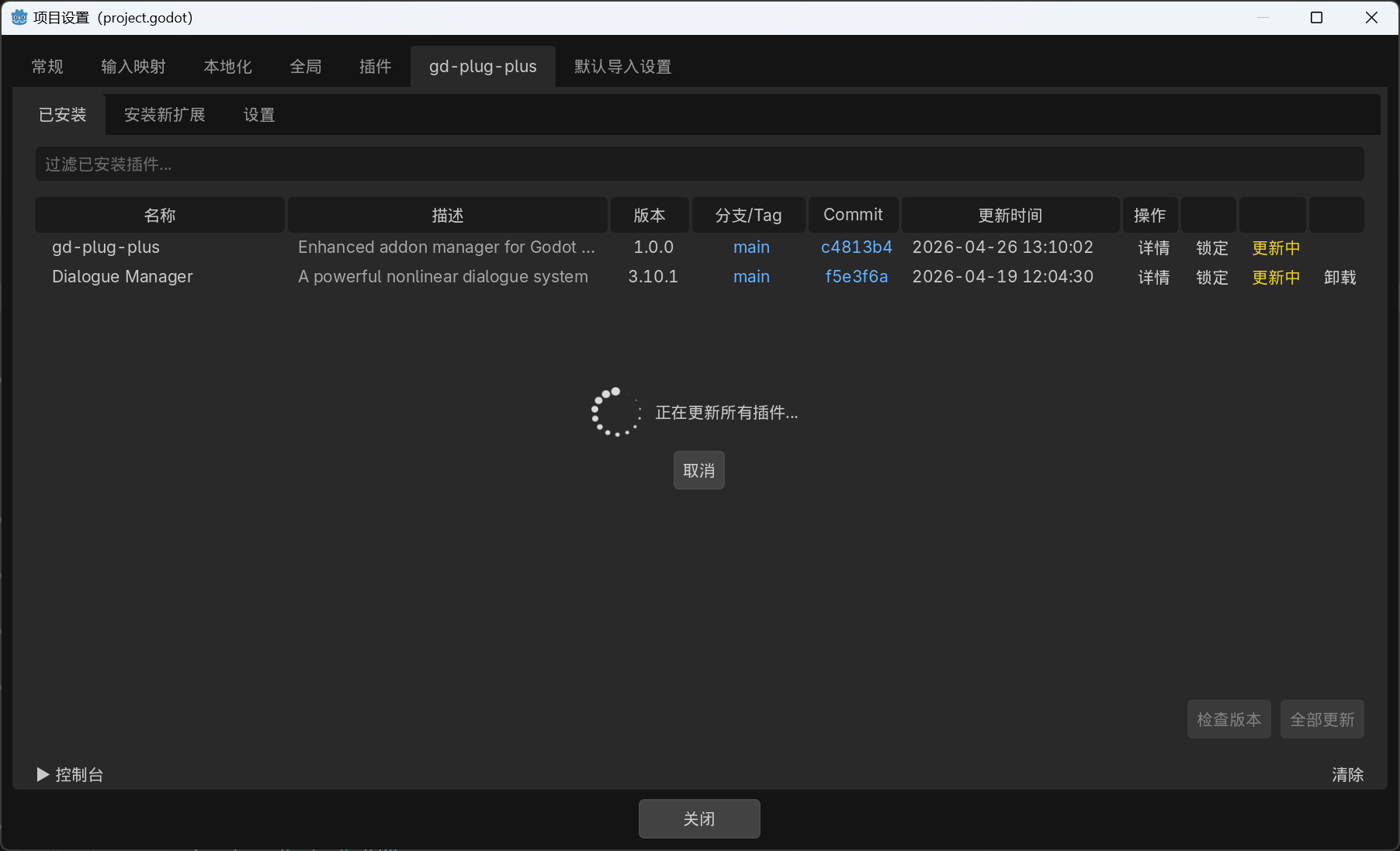 A plugin manager for Godot 4.x with built-in editor UI. Manage addon installation, updates, and version pinning — all from within the editor, no config scripts needed.