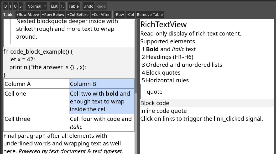 - RichTextEdit: A fully editable rich text control with: - Inline formatting toggles: bold, italic, underline, strikethrough - Headings, bullet lists, numbered lists (via API) - Table support: insert, add/remove rows and columns - Keyboard shortcuts (Ctrl+B/I/U, Ctrl+Z/Y, etc.) - Mouse selection, double-click word select, triple-click line select, drag select - Rich clipboard (copy/paste preserves formatting) - Undo/redo - Caret blinking, zoom, word wrap, horizontal and vertical scrolling - RichTextView: A read-only rich text display control with: - Optional text selection and copy - Clickable links and images (via signals) - Zoom, word wrap, vertical scrolling Both controls accept content as **plain text**, **HTML**, or **Markdown**, and render block-level elements including headings, lists, blockquotes, code blocks, tables, inline code, and horizontal rules. |