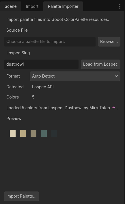 | Description | Editor dock that allows import of Lospec HEX, GIMP GPL, Photoshop ASE, JASC PAL, Paint.NET TXT, and direct Lospec palettes as ColorPalette resources. |