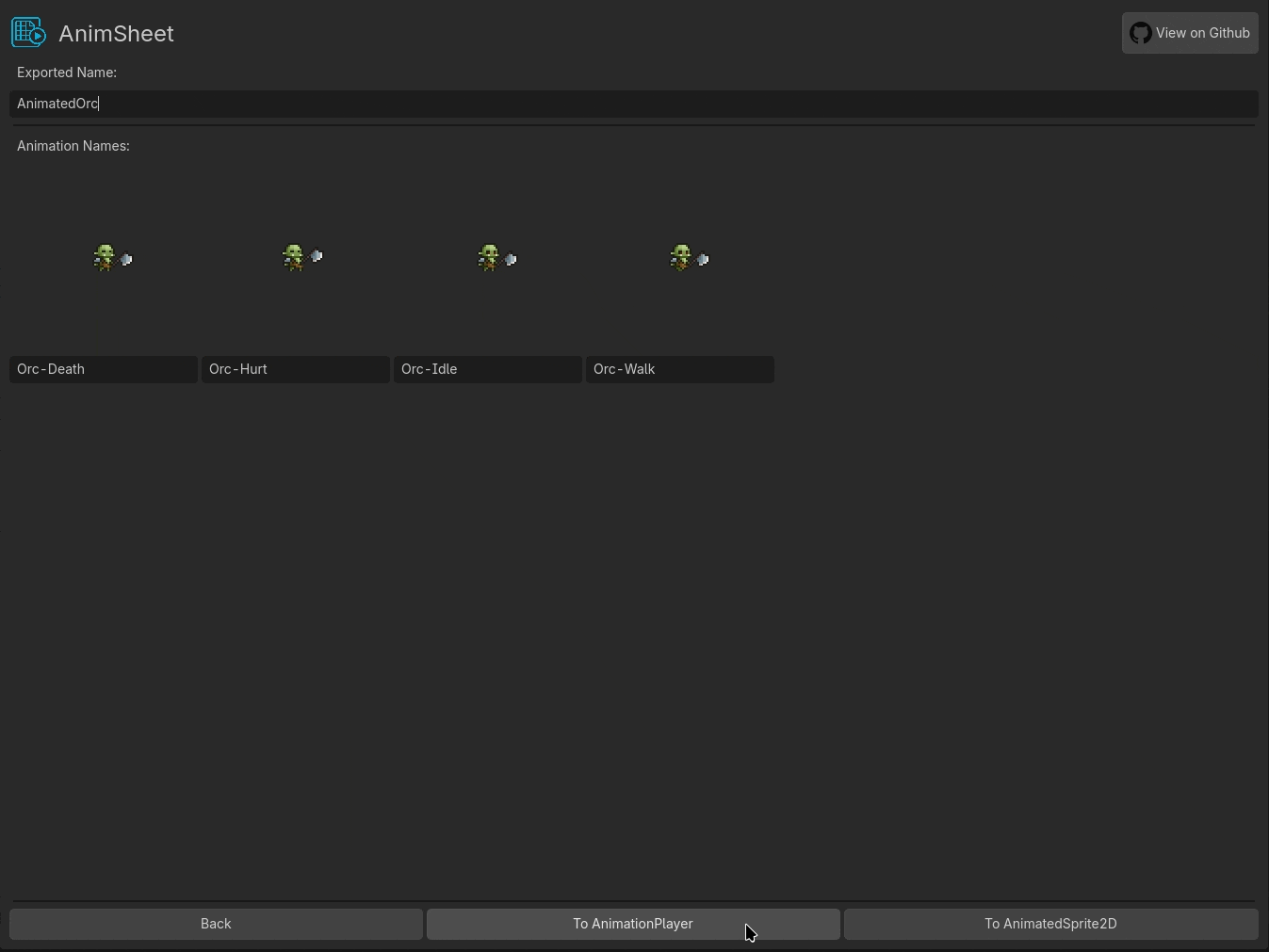 | Title | AnimSheet – Sprite Sheets to AnimatedSprite2D & AnimationPlayer | AnimSheet – Sprite Sheets to AnimatedSprite2D & AnimationPlayer |