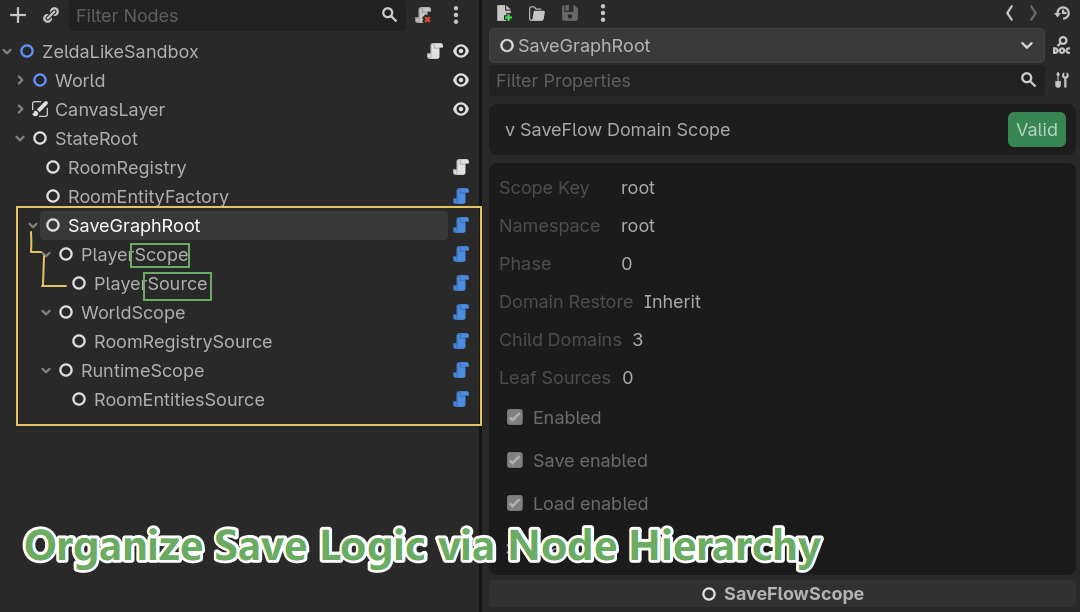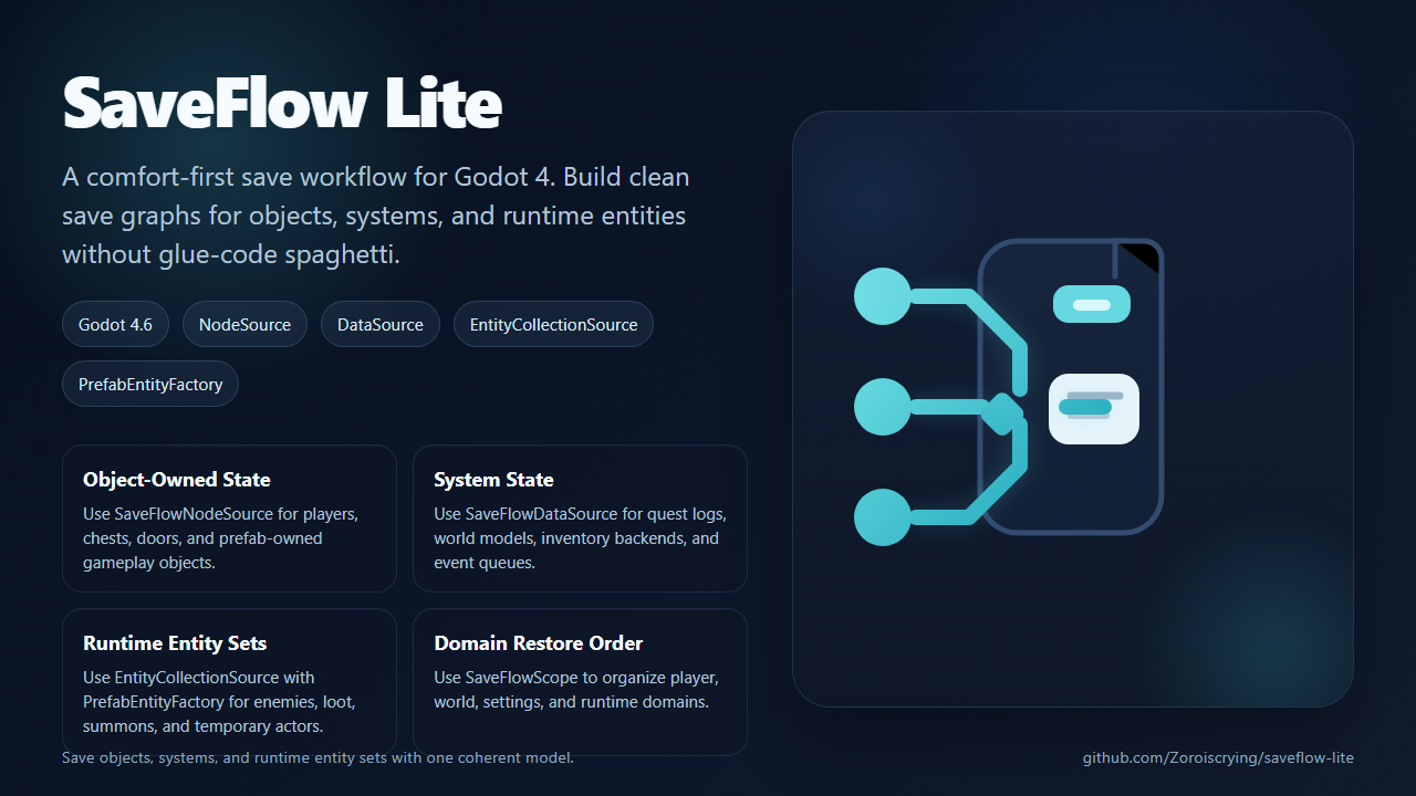 A comfort-first save workflow plugin for Godot 4. Build clean save graphs for objects, systems, and runtime entities without glue-code spaghetti. Suggested Feature List: - SaveFlowNodeSource for object-owned state, built-in node state, and selected child participants - SaveFlowDataSource for system, table, queue, and model-style state - SaveFlowEntityCollectionSource for runtime entity sets - SaveFlowPrefabEntityFactory for default prefab-backed runtime restore - SaveFlowScope for domain boundaries, restore order, and hierarchical save graphs - Slot helpers for save, load, delete, copy, rename, list, and metadata - JSON in editor and binary in export through AUTO format - Inspector previews for main SaveFlow components |