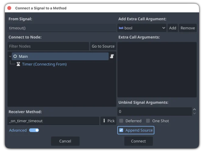 When connecting signals in the editor, you’ll notice a new “Append Source” option in the advanced settings. If this checkbox is enabled, the source object will be appended right after the original arguments of the signal.