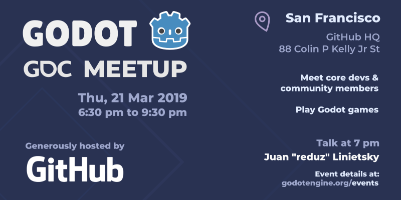 Like last year, our friends at GitHub provide us with the awesome opportunity to organize a Godot Meetup at their headquarters during GDC!