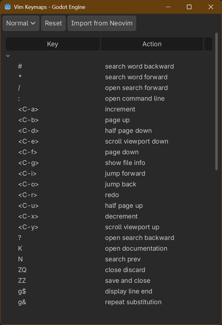 - All Vim modes (Normal, Insert, Visual, V-Line, V-Block, Command-line, Replace)