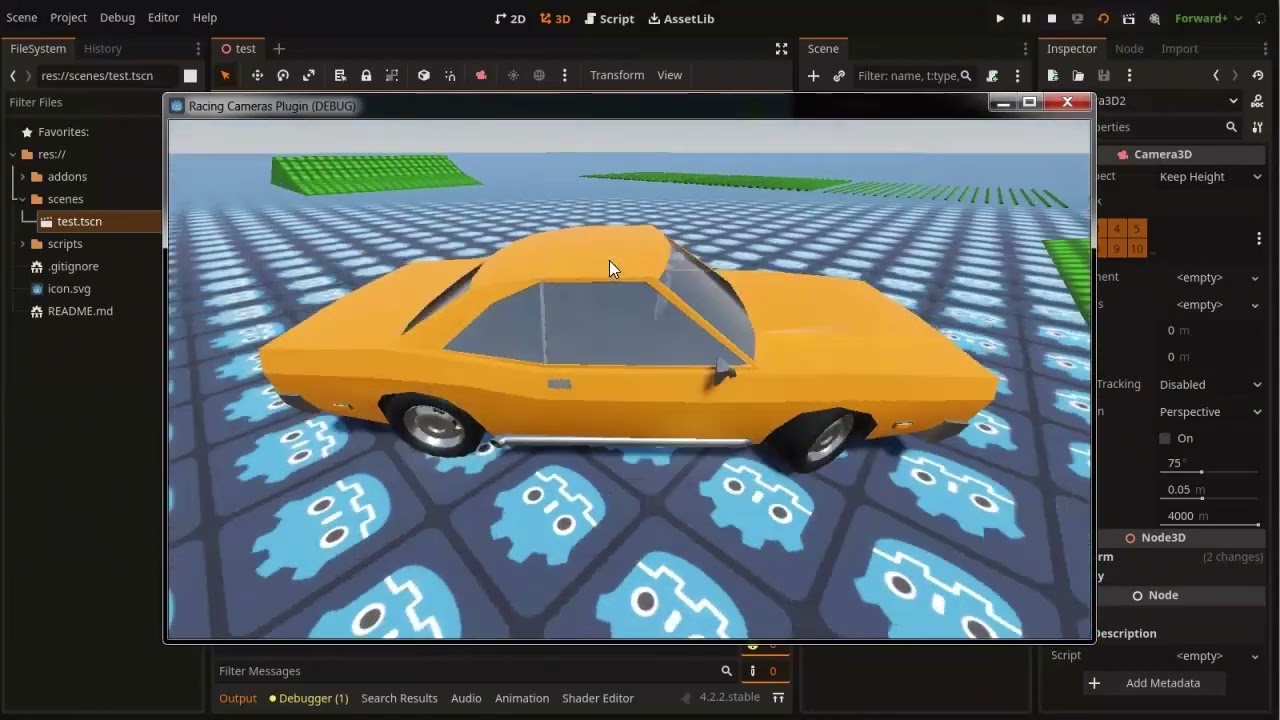 This plugin provides a handful of handy cameras for prototyping racing games. It creates an autoloaded singleton that automtically manages the cameras and allows you to switch between them. There are four vehicle cameras: - RacingChaseCamera - a camera that chases the vehicle - RacingMountedCamera - a camera that allows you to switch between multiple user-defined positions on the vehicle - RacingOrbitCamera - a camera that orbits around the vehicle, controlled with the mouse - RacingCockpitCamera - a cockpit camera, which you can look around with, using the mouse And one external camera: - RacingTrackCamera - a camera that automatically switches between user-defined positions around the track in order to follow the vehicle. Check out the documentation for more information, and the example scenes to see all the cameras in action. |