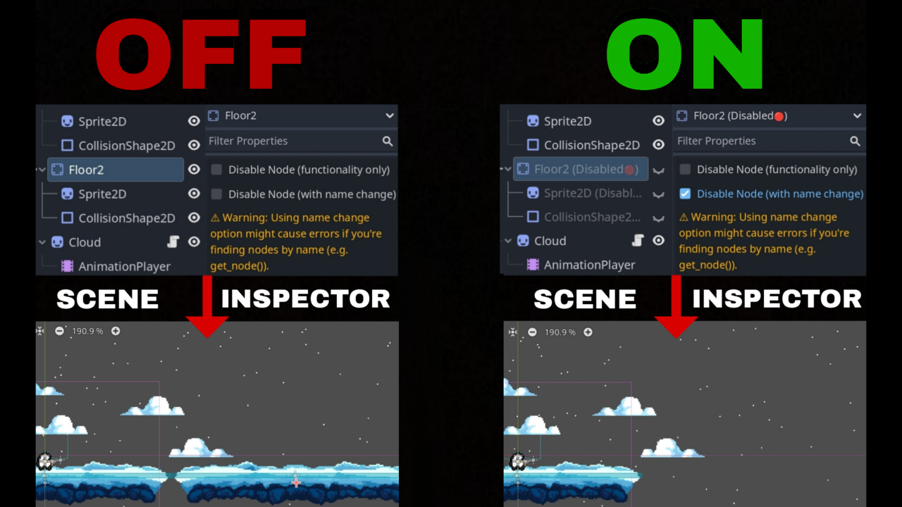 | Description | This tool allows you to completely disable 3D or 2D selected nodes and their children directly from the Inspector. This functionality is useful for testing and debugging, as it lets you deactivate parts of your scene without removing them, ensuring they don't affect the game's behavior during runtime if they are not needed. | This tool allows you to completely disable 3D or 2D selected nodes and their children directly from the Inspector. This functionality is useful for testing and debugging, as it lets you deactivate parts of your scene without removing them, ensuring they don't affect the game's behavior during runtime if they are not needed. |
